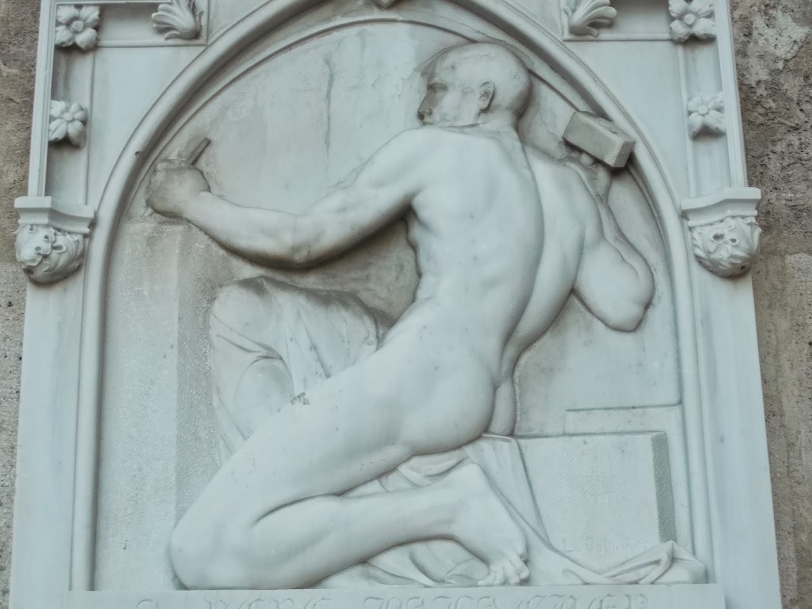 A partir de una idea inicial realizamos unos dibujos previos de gatos en posición de alerta delante de una rata.Partiendo de un bloque de piedra irregular, realizamos el sillar o sólido capaz con las dimensiones adecuadas a la obra a realizar. Sobre este sillar realizamos el contorno del boceto elegido. Empezamos a retirar la piedra sobrante para ajustarnos al perfil del dibujoo, hasta que tengamos hechos paramentos lisos o caras planas. Después empezamos a retirar la piedra sobrante trazando curvas a lo largo de la piedra perfilando las formas adecuadas. Iremos retirando la piedra dando forma según la intuición del artista que realiza esta talla libre. En zonas de especial dificultad podremos ayudarnos de radial, limas, etc. El acabado lo haremos de tal forma que las dos figuras queden lijadas y el resto abujardado, para así hacer resaltar el gato y la rata de este relieve con esculturas de bulto redondo.